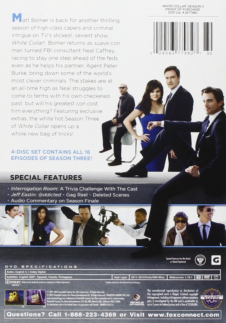Cantidad de Discos: 4 | Lanzamiento: 2009 | Género(s): Serie de TV. Drama. Acción | Audio: Inglés | Subtítulos: Francés, Español, Inglés | Título: White Collar: Season 3 | Director(es): Jeff Eastin (Creador), Paul Holahan, John T. Kretchmer, Michael Smith, Russell Lee Fine, Dennie Gordon, Kevin Bray, David Straiton, Tricia Brock, Allan Arkush, Bronwen Hughes | Reparto: Matt Bomer, Tim DeKay, Willie Garson, Tiffani Thiessen, Sharif Atkins, Diahann Carroll, Marsha Thomason, Hilarie Burton, James Rebhorn, Natalie Morales, Sheena Colette, Gloria Votsis, Alexandra Daddario, Alex Kruz, Ross McCall, Judith Ivey, Noah Emmerich | Norma / Región: NTSC 1 | Cantidad de Discos: 4 | Lanzamiento: 2009 | Género(s): Serie de TV. Drama. Acción | Audio: Inglés | Subtítulos: Francés, Español, Inglés | Título: White Collar: Season 3 | Director(es): Jeff Eastin (Creador), Paul Holahan, John T. Kretchmer, Michael Smith, Russell Lee Fine, Dennie Gordon, Kevin Bray, David Straiton, Tricia Brock, Allan Arkush, Bronwe