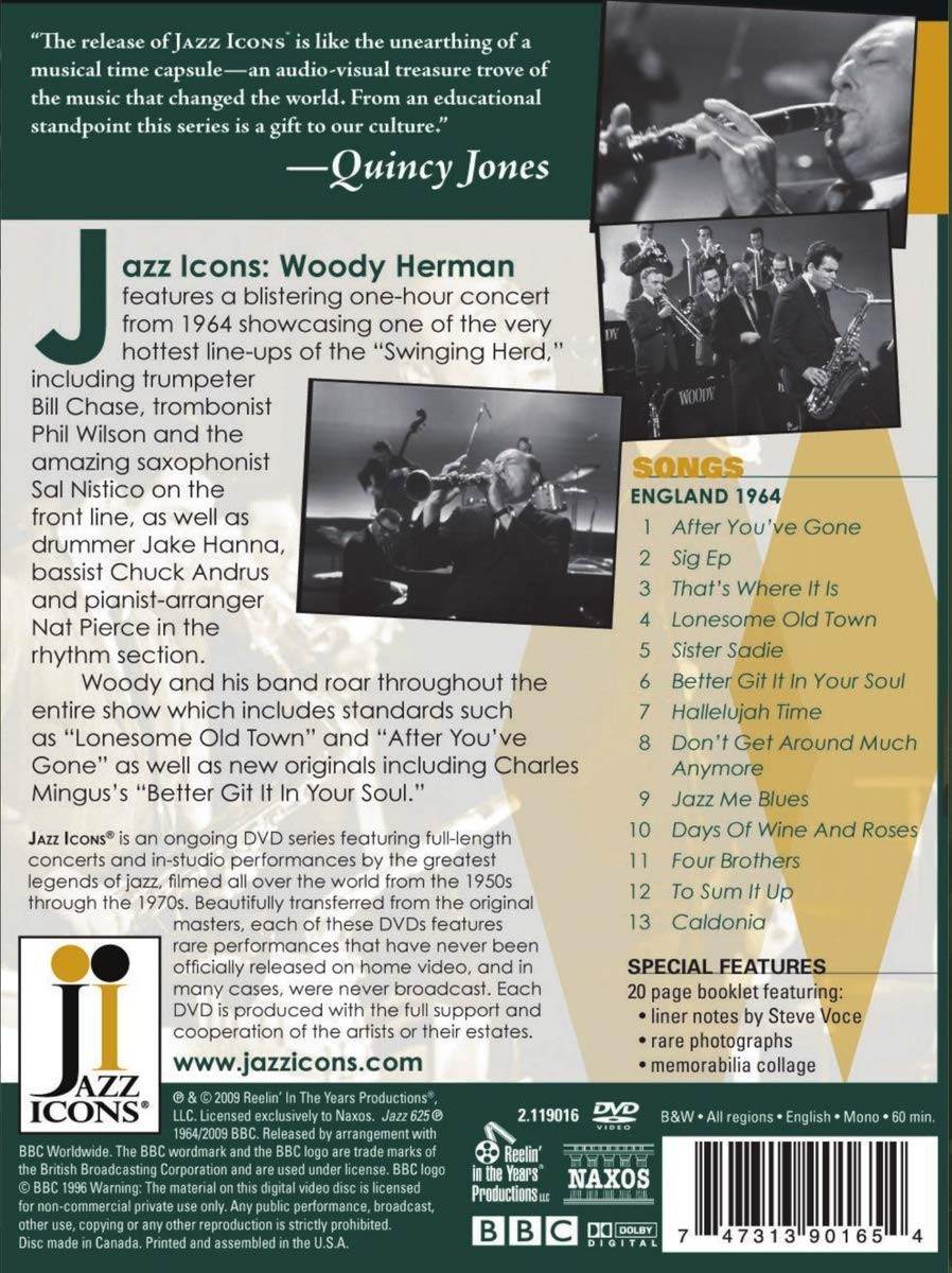 Iconos del jazz: Woody Herman presenta un espectacular concierto de una hora de 1964 que presenta una de las alineaciones más populares del ‘Swinging Herd’, que incluye al trompetista Bill Chase, el trombonista Phil Wilson y el increÃble saxofonista Sal Nistico en primera lÃnea, como asà como el baterista Jake Hanna, el bajista Chuck Andrus y el pianista-arreglista Nat Pierce en la sección rÃtmica. Woody y su banda rugen durante todo el espectáculo, que incluye estándares como ‘Lonesome Old Town’ y ‘After You ve Gone’, asà como nuevos originales, incluido ‘Better Git It In Your Soul’ de Charles Mingus.