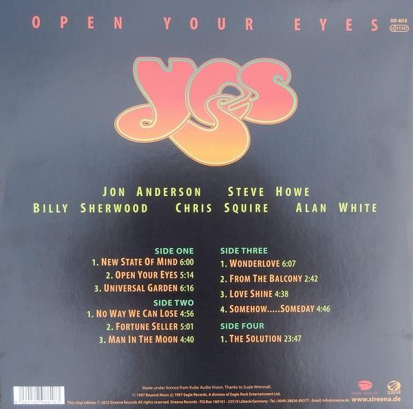 Artista(s) / Grupo: Yes | Cantidad de Discos: 2 LP | Lanzamiento: 2012 | Género(s): Rock | Estilo(s): Prog Rock | TÃtulo: Open Your Eyes | Artista(s) / Grupo: Yes | Cantidad de Discos: 2 LP | Lanzamiento: 2012 | Género(s): Rock | Estilo(s): Prog Rock | TÃtulo: Open Your Eyes