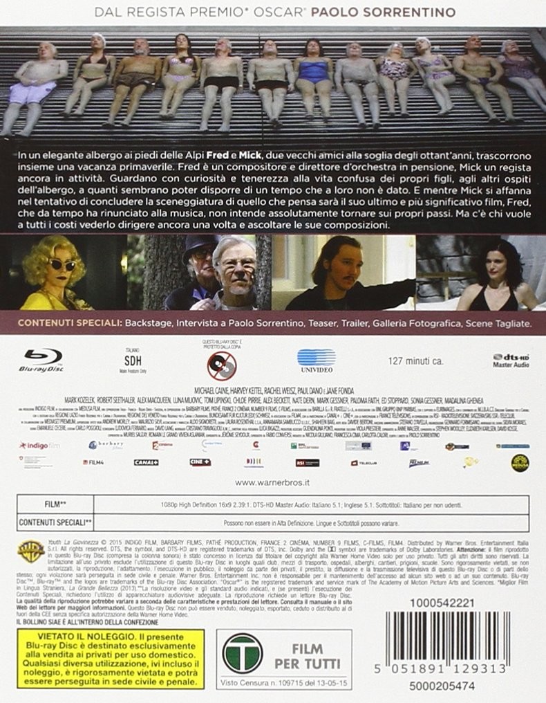 Cantidad de Discos: 1 | Lanzamiento: 2015 | Género(s): Drama | Audio: Inglés, Italiano | SubtÃtulos: Italiano | TÃtulo: La juventud | Director(es): Paolo Sorrentino | Reparto: Michael Caine, Harvey Keitel, Rachel Weisz, Paul Dano, Jane Fonda, Tom Lipinski, Poppy Corby-Tuech, Madalina Ghenea, Emilia Jones, Mark Kozelek, Anabel Kutay, Rebecca Calder, Ian Keir Attard, Roly Serrano | Norma / Región: PAL (Región B) | Cantidad de Discos: 1 | Lanzamiento: 2015 | Género(s): Drama | Audio: Inglés, Italiano | SubtÃtulos: Italiano | TÃtulo: La juventud | Director(es): Paolo Sorrentino | Reparto: Michael Caine, Harvey Keitel, Rachel Weisz, Paul Dano, Jane Fonda, Tom Lipinski, Poppy Corby-Tuech, Madalina Ghenea, Emilia Jones, Mark Kozelek, Anabel Kutay, Rebecca Calder, Ian Keir Attard, Roly Serrano | Norma / Región: PAL (Región B)